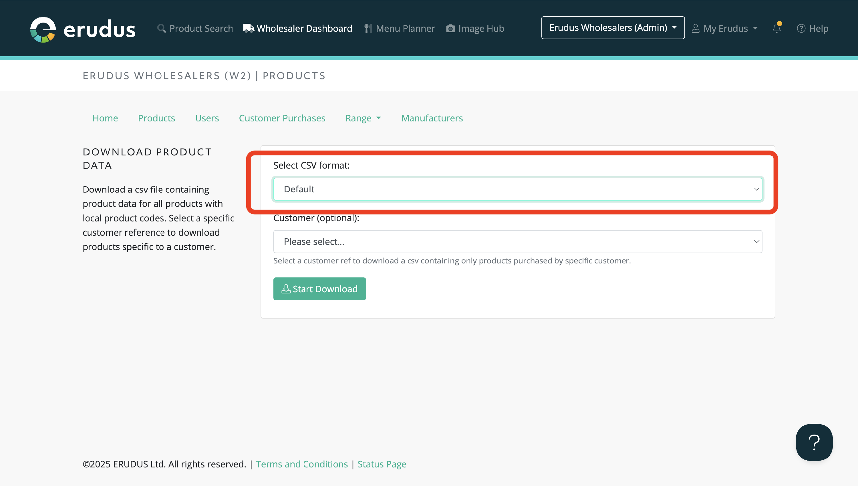 Download CSV - Download a CSV file containing all of the product data for all products that you have a Wholesaler Product Code attached to.