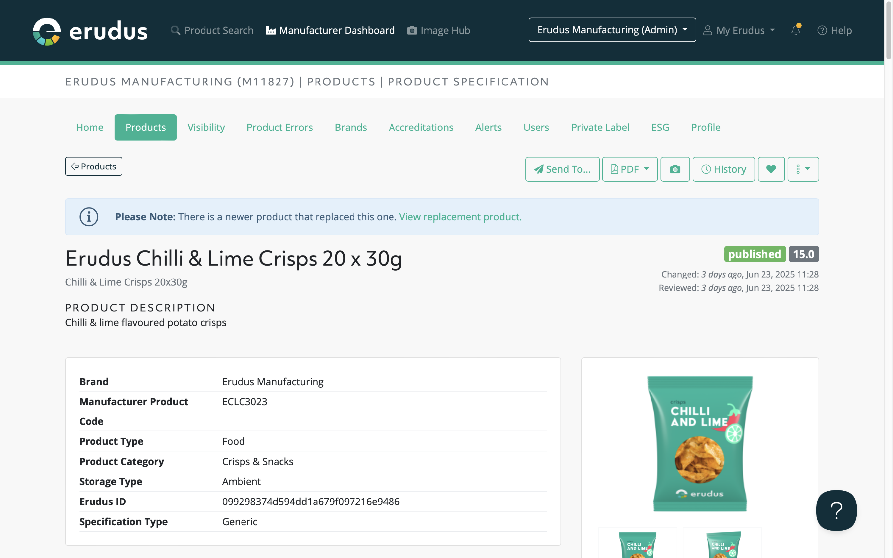 Once you have created a replacement, a link is created between the old product and the new one. When viewing the old product in Erudus, a banner is presented across the top of the page, which highlights that the product has been replaced with a link to the new one.