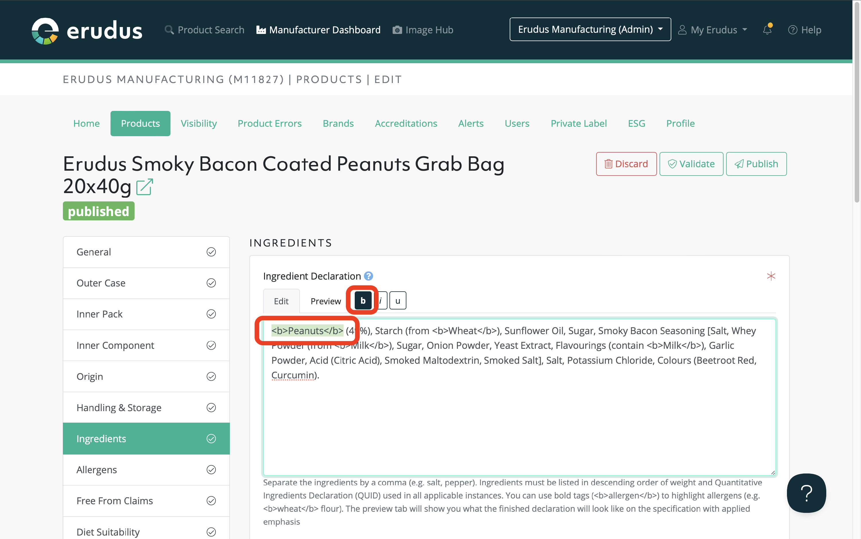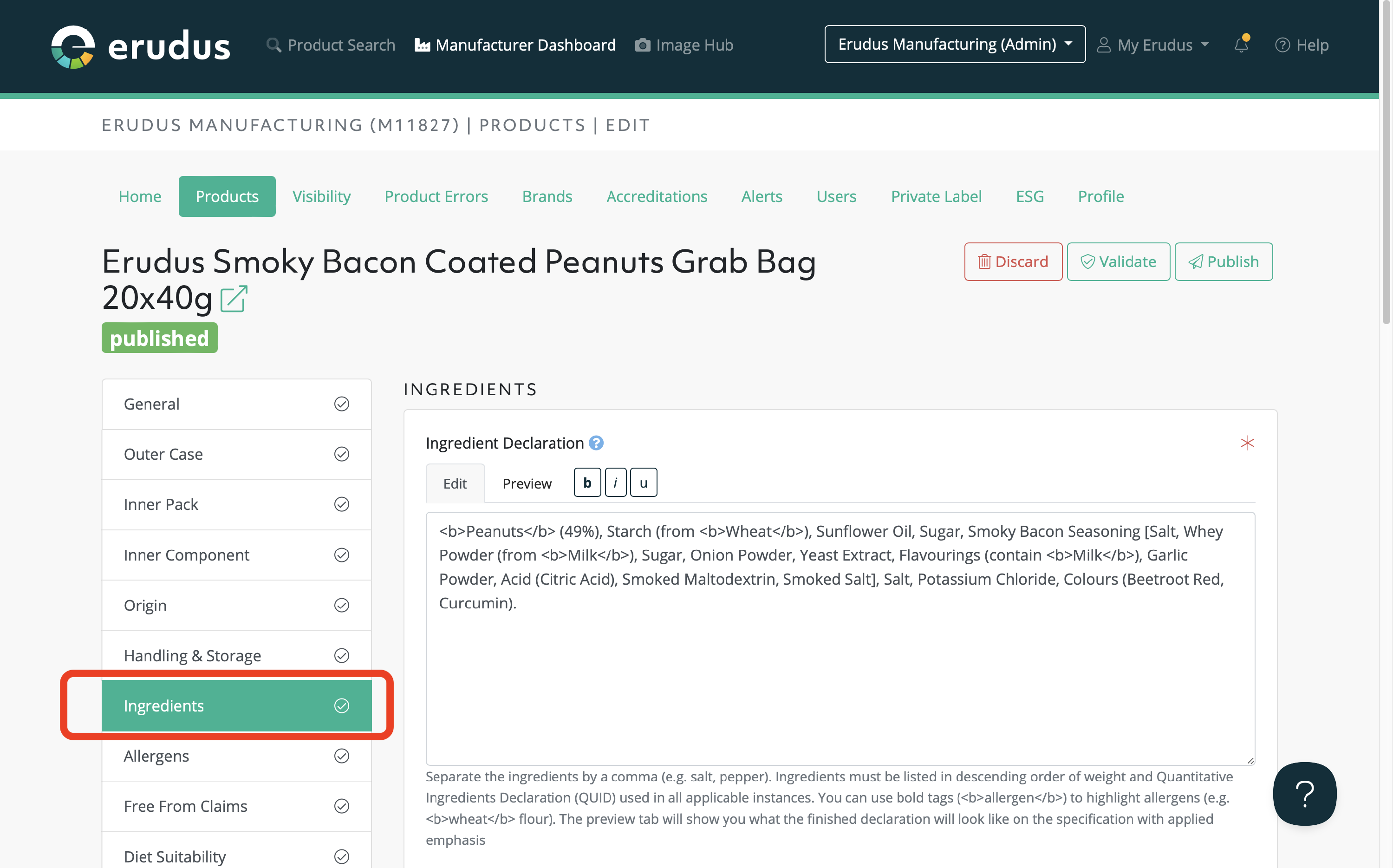 When viewing the Ingredients section within the Erudus product editor