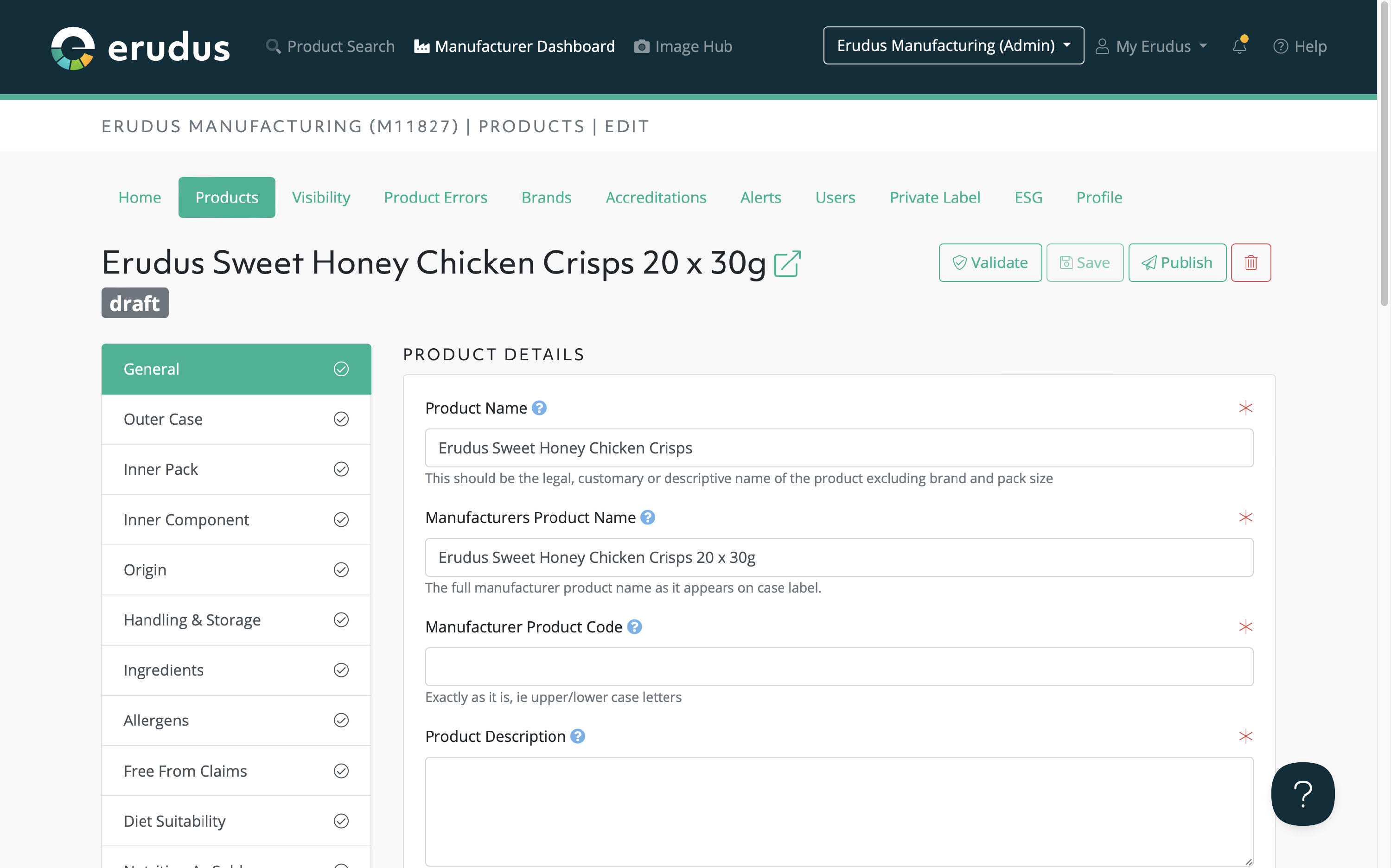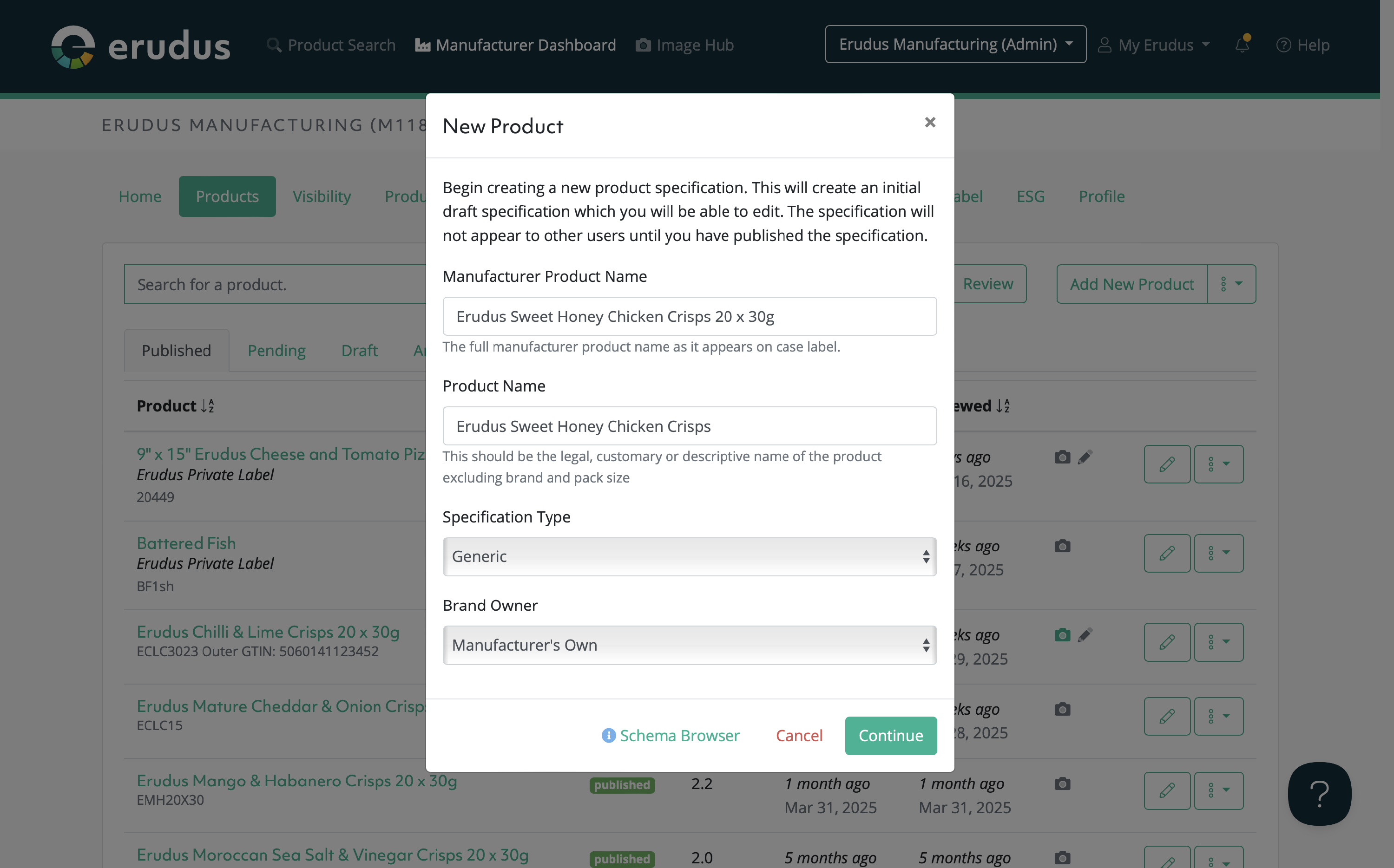 A product in Erudus is a completed technical product specification; it's a digital representation of everything that's included with the physical product that consumers may see on a shelf or wholesalers receive a delivery of. Erudus intentionally uses the term "product" instead of "specifications" or "SKUs" for a few key reasons, primarily focused on simplicity and user experience across the entire food supply chain. We believe it makes it clear and removes any industry terminology that others may not be as familiar with.