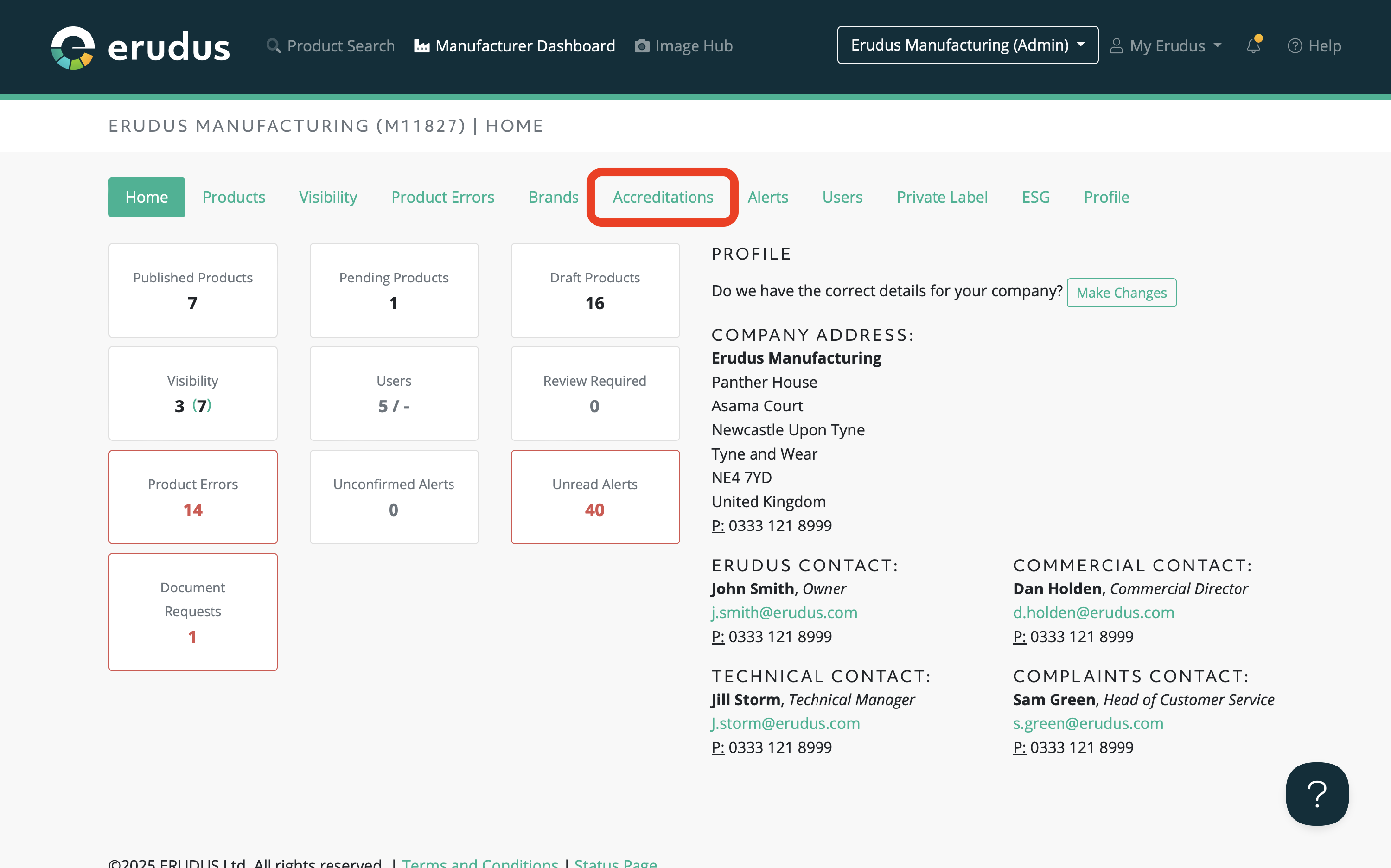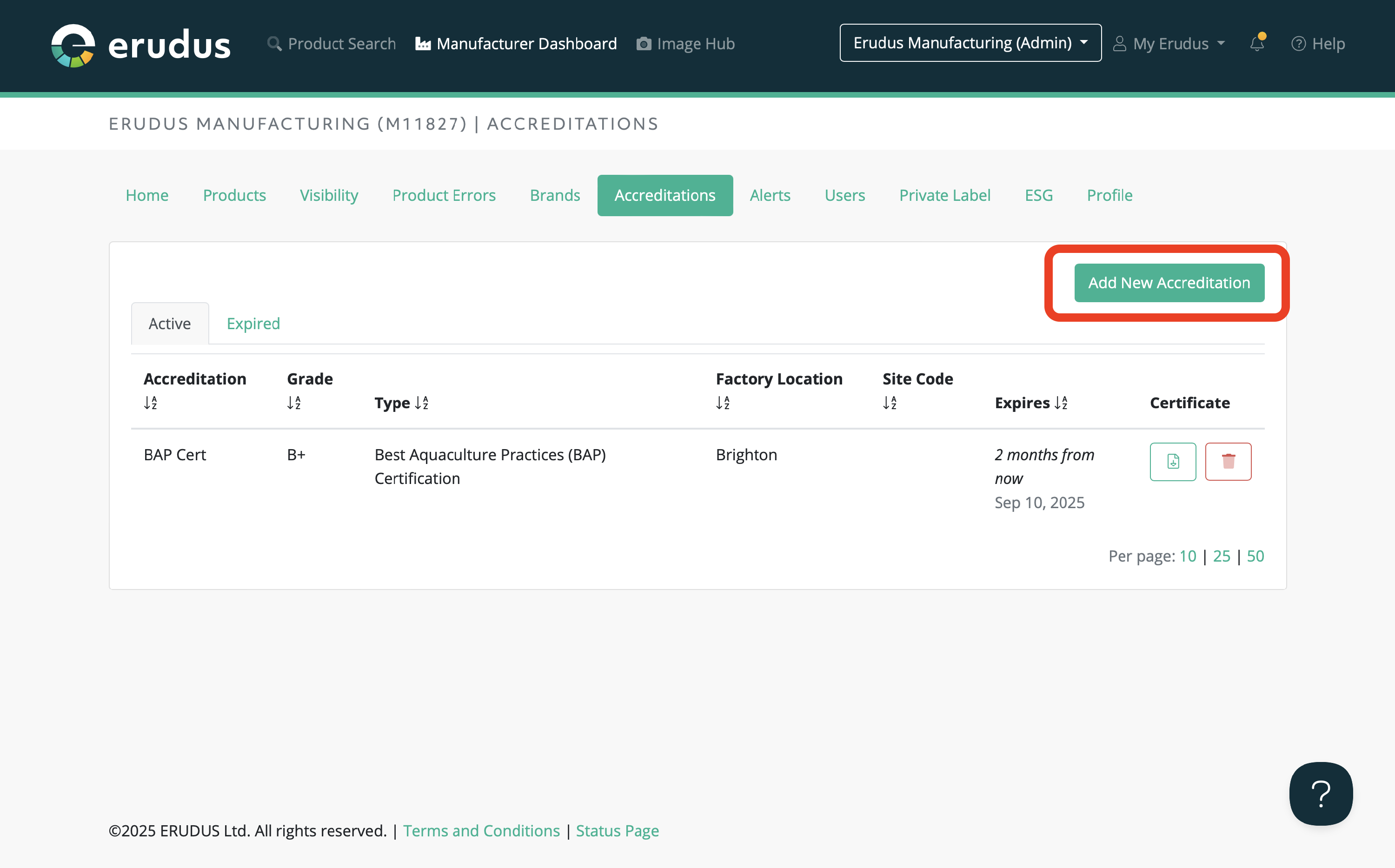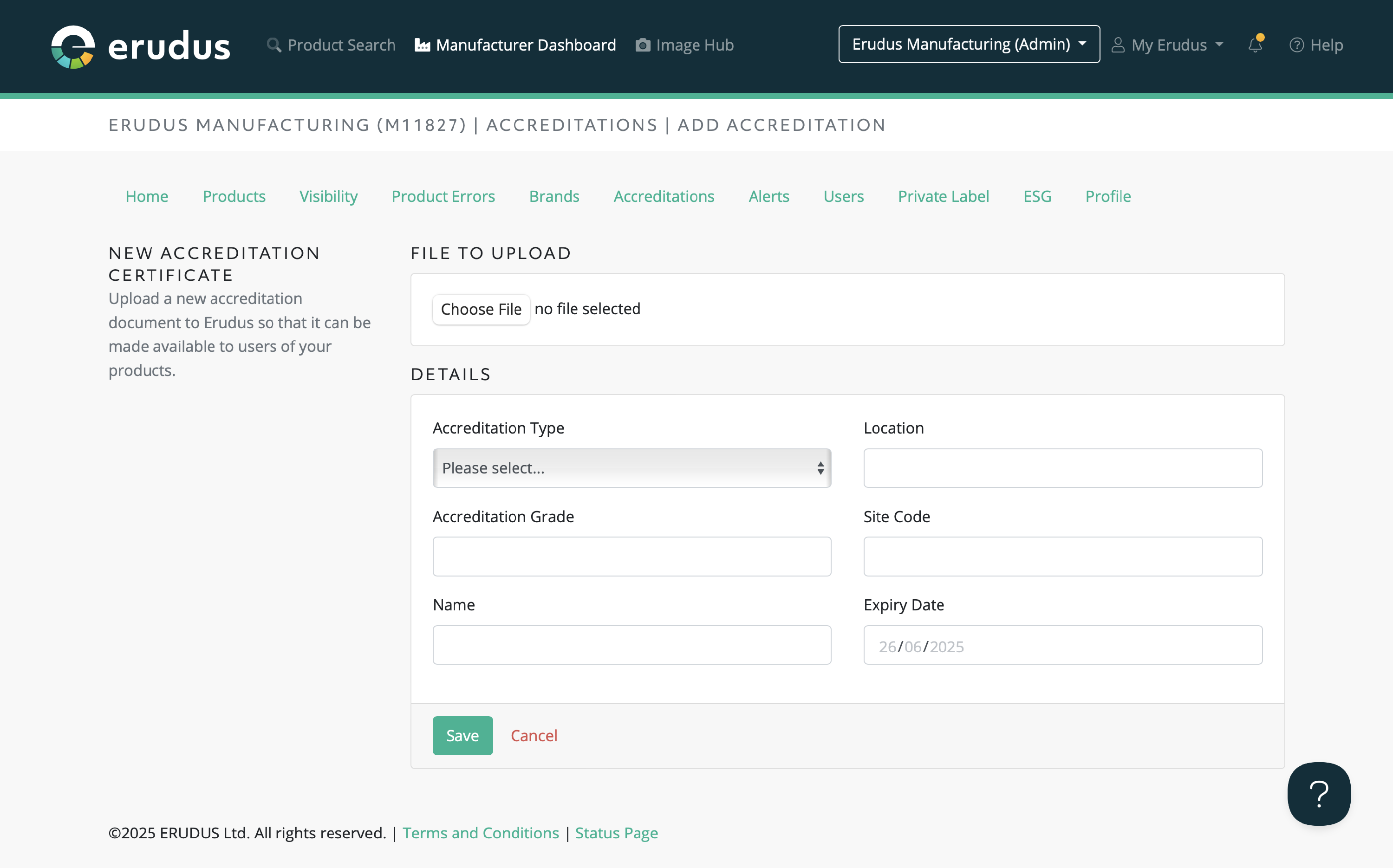 This guide will show you how to add a new accreditation to your Erudus manufacturing account. To apply an accreditation against a specific product, follow the "How to apply an accreditation to a specific product" guide.