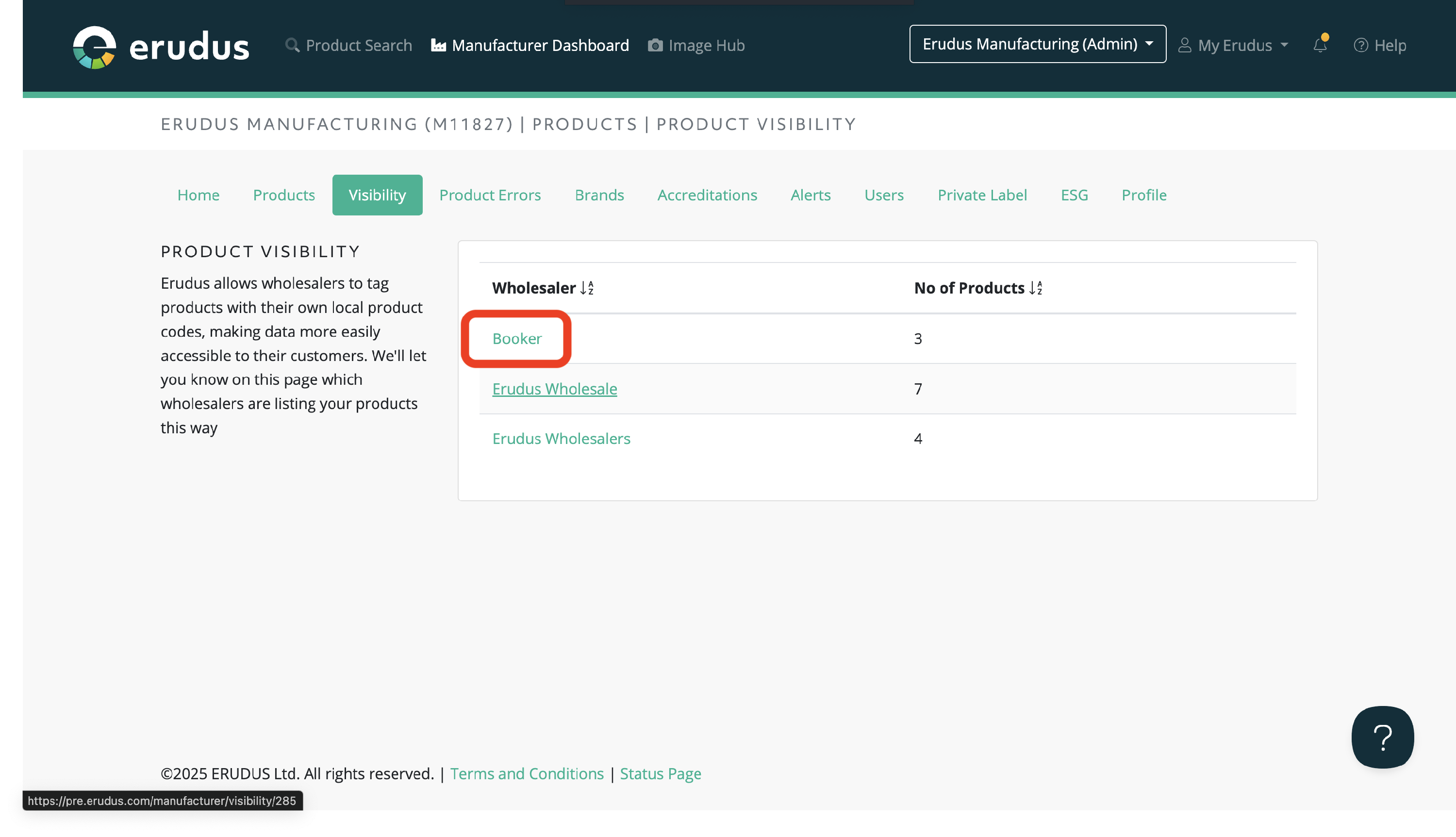 The Visibility section provides you with a list of any wholesaler that has one of their Wholesaler Product Codes linked with your products.