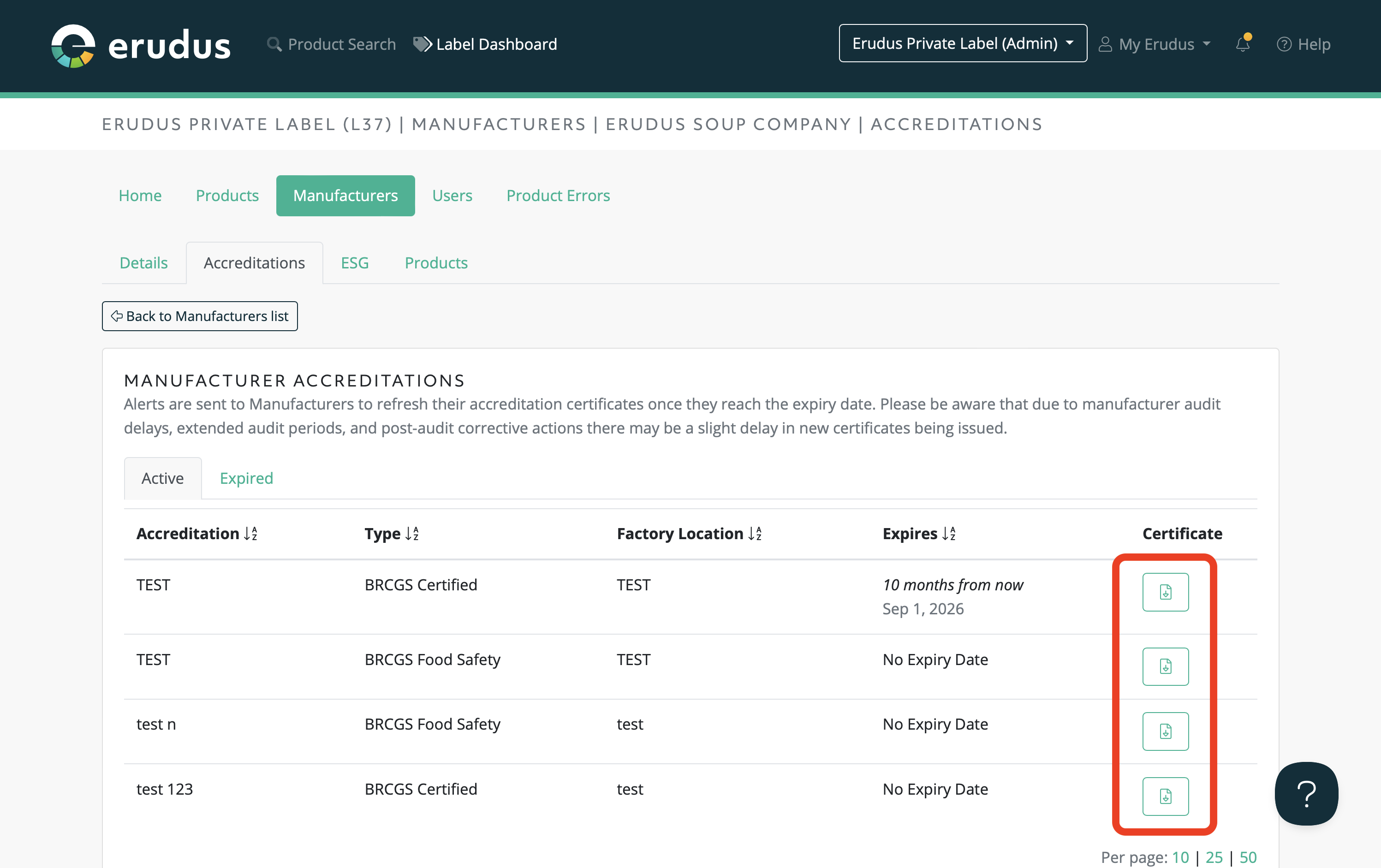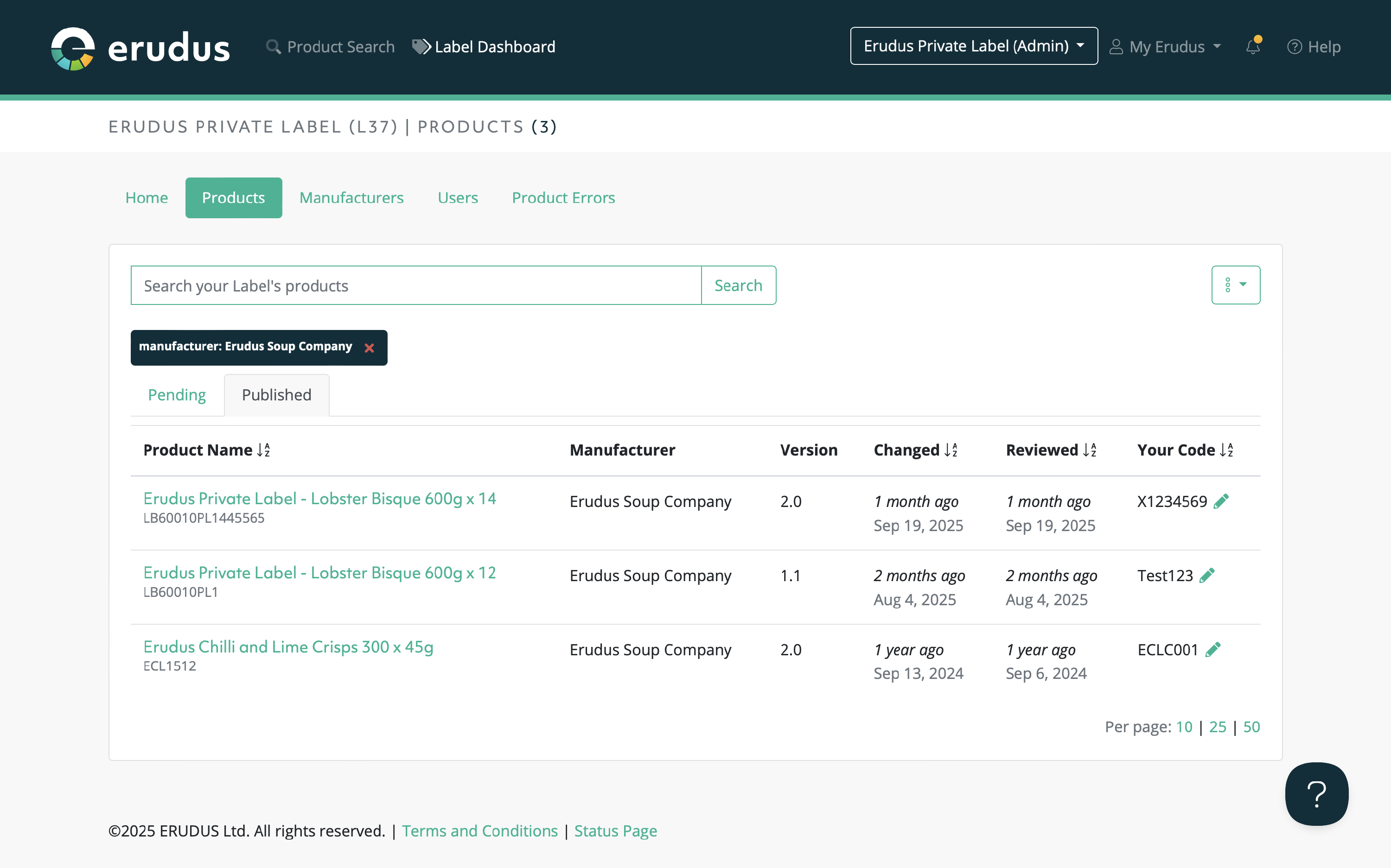 As an Erudus own label admin, you are able to view a list of all the own label manufacturers that are currently publishing your own label products in Erudus. You are able to view the following:
