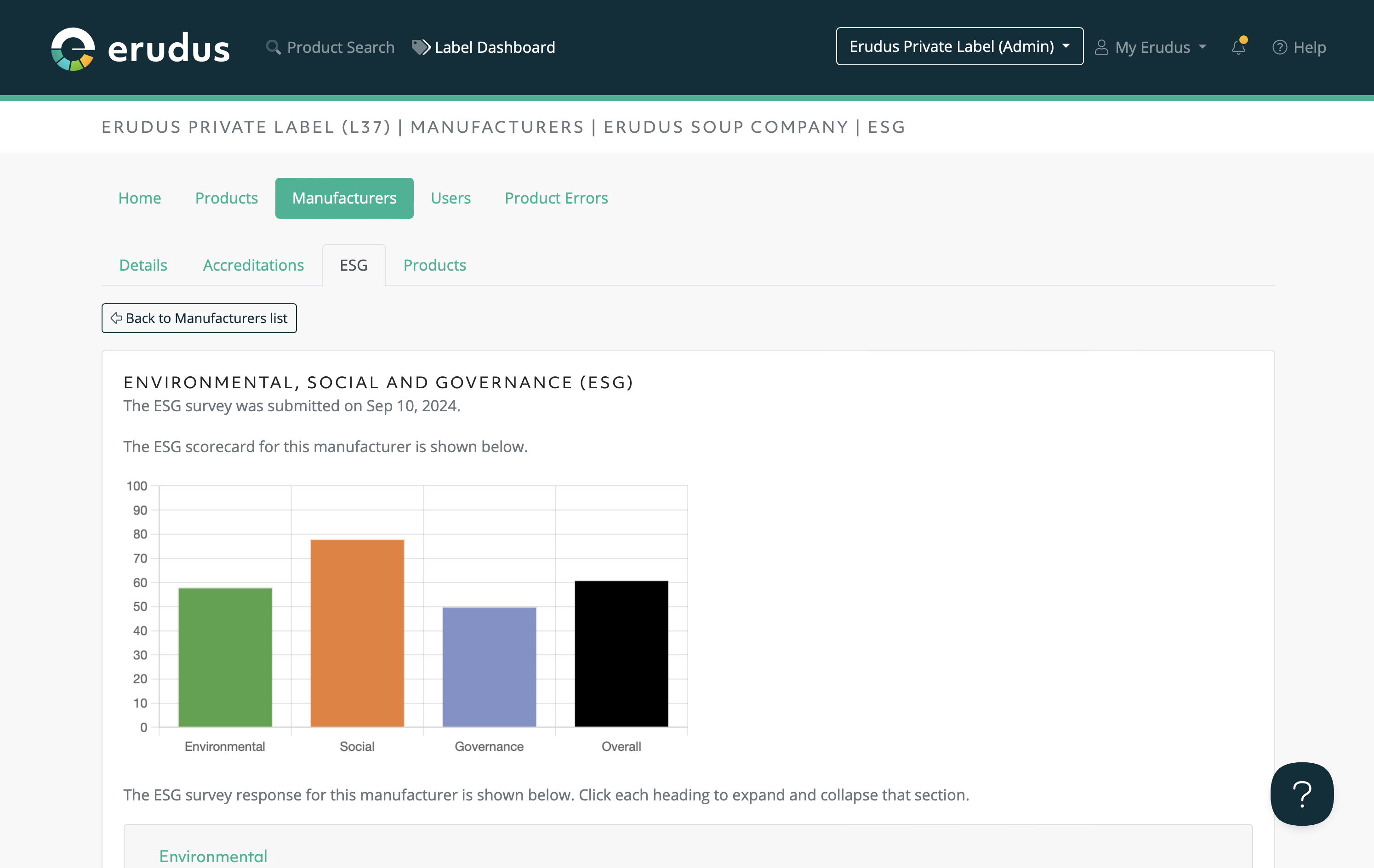 Clicking the "ESG" tab will show you the responses to that Manufacturer's ESG survey responses with their ESG scorecard (hovering your mouse over the bars on the scorecard will show the score for each area)