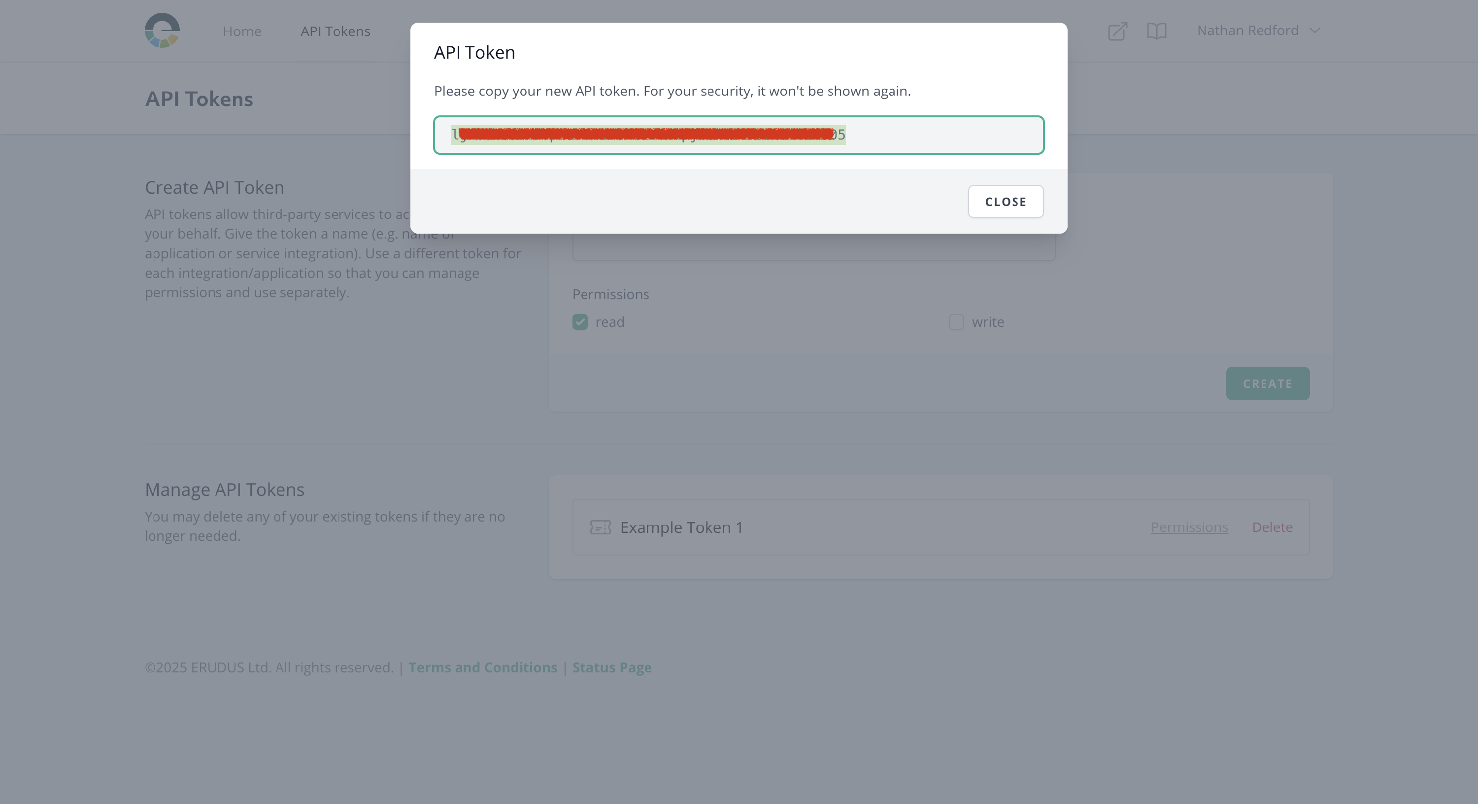 Once the token has been created, you'll see a pop up appear with the API token, it is important that you copy this token and understand that this is never surfaced again, you will not be able to find the exact token again once the pop up has closed down so we'd recommend copying this and saving the token externally if you require to re-use it.