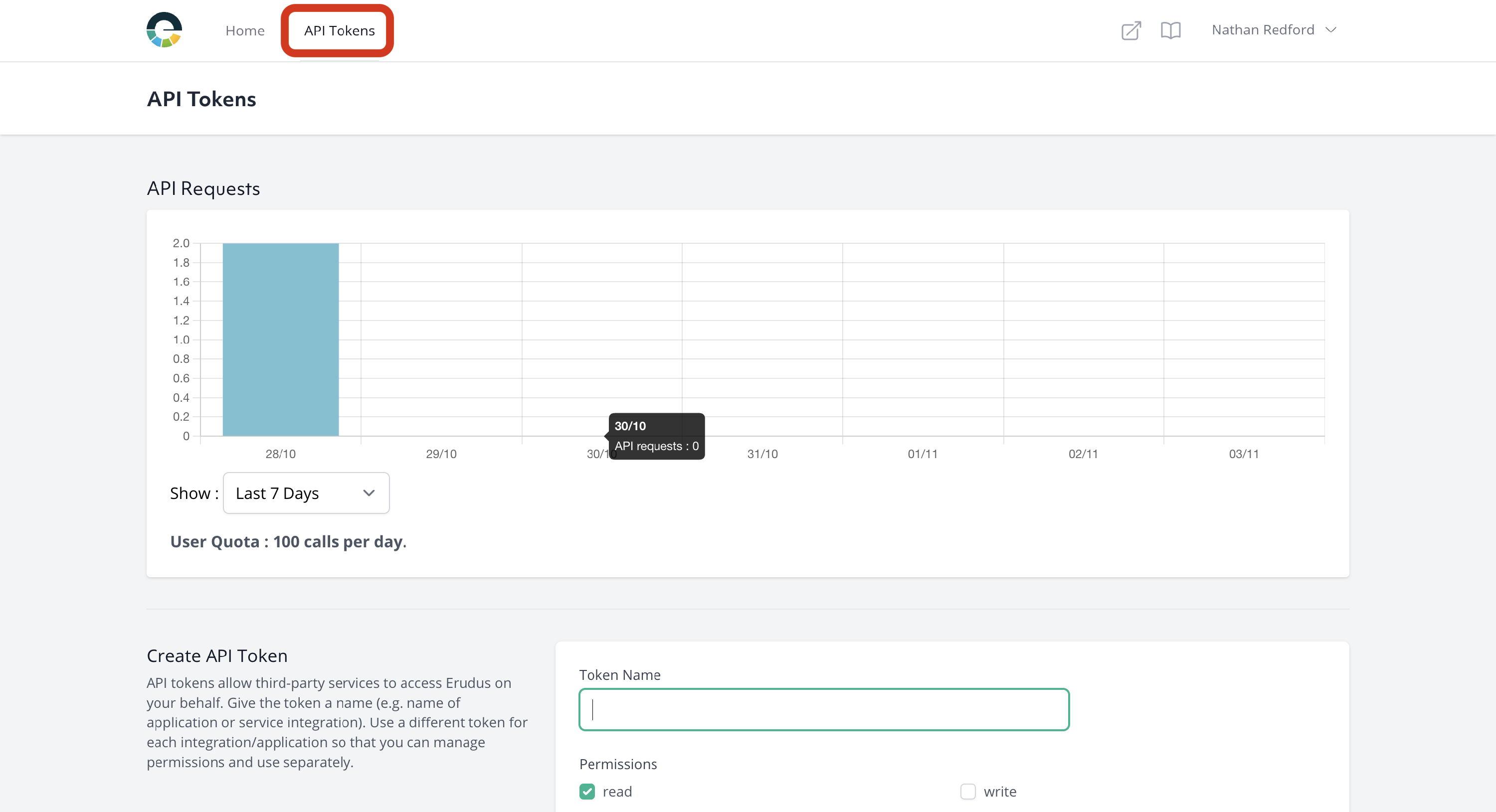 You can find an overview of each token's usage by selecting API Token from the banner at the top of the page. This will present you with a way to generate new tokens or manage your existing tokens.