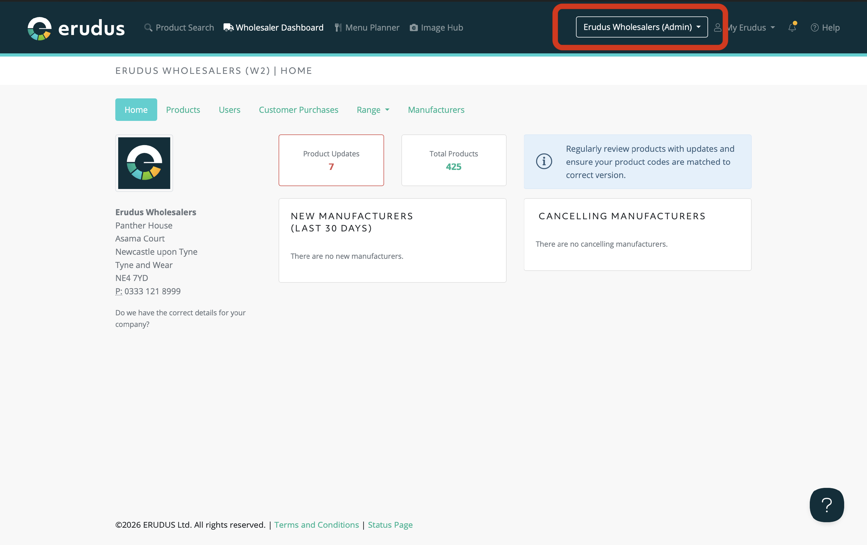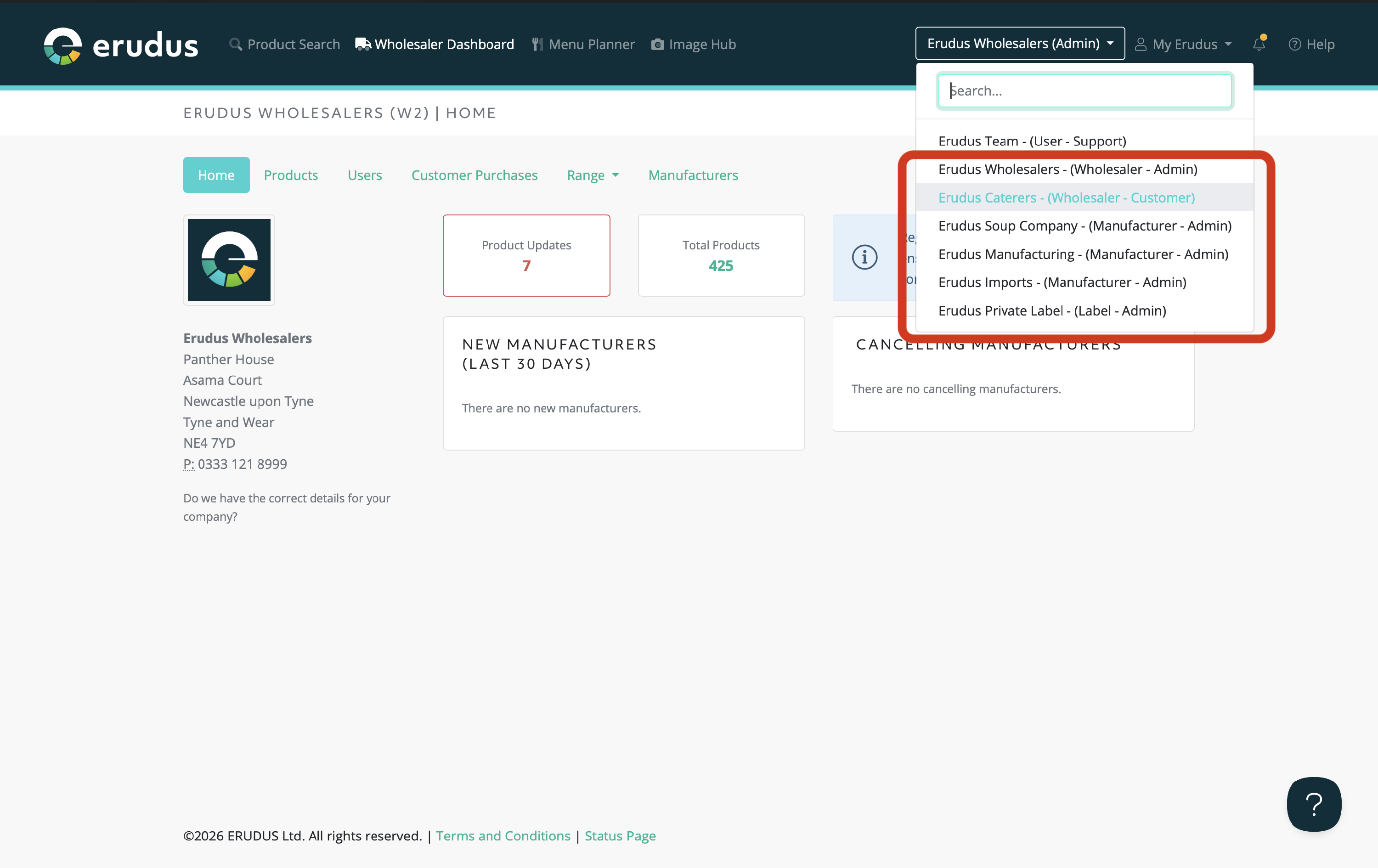 If you have access to multiple Erudus accounts (such as Manufacturer, Wholesaler, or Caterer)