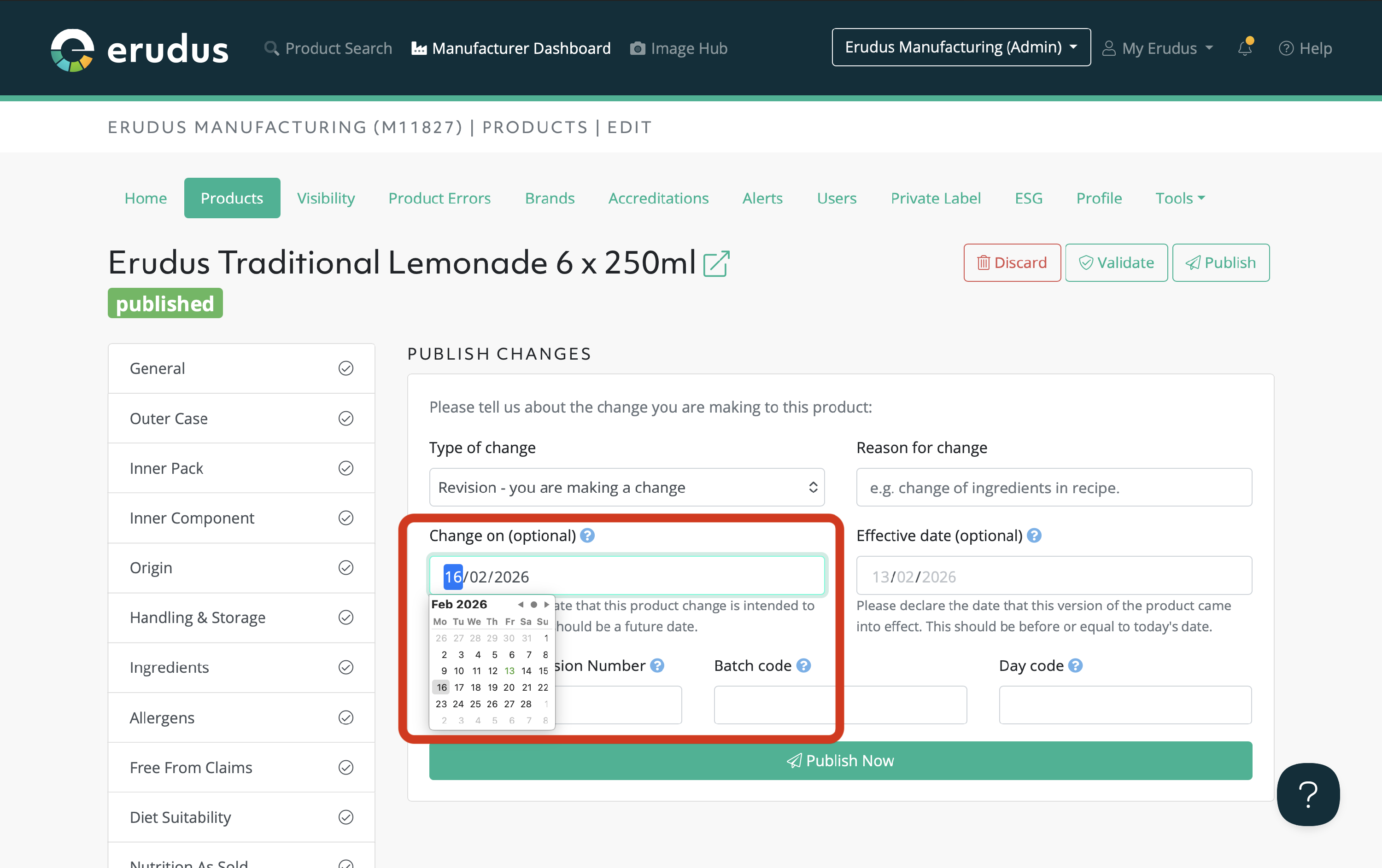 A scheduled product change allows you to specify a date when a product is published and visible to the Erudus datapool. Instead of selecting Publish Now, you select a future change-on date for the product or changes to become visible to Erudus Wholesalers and Caterers.