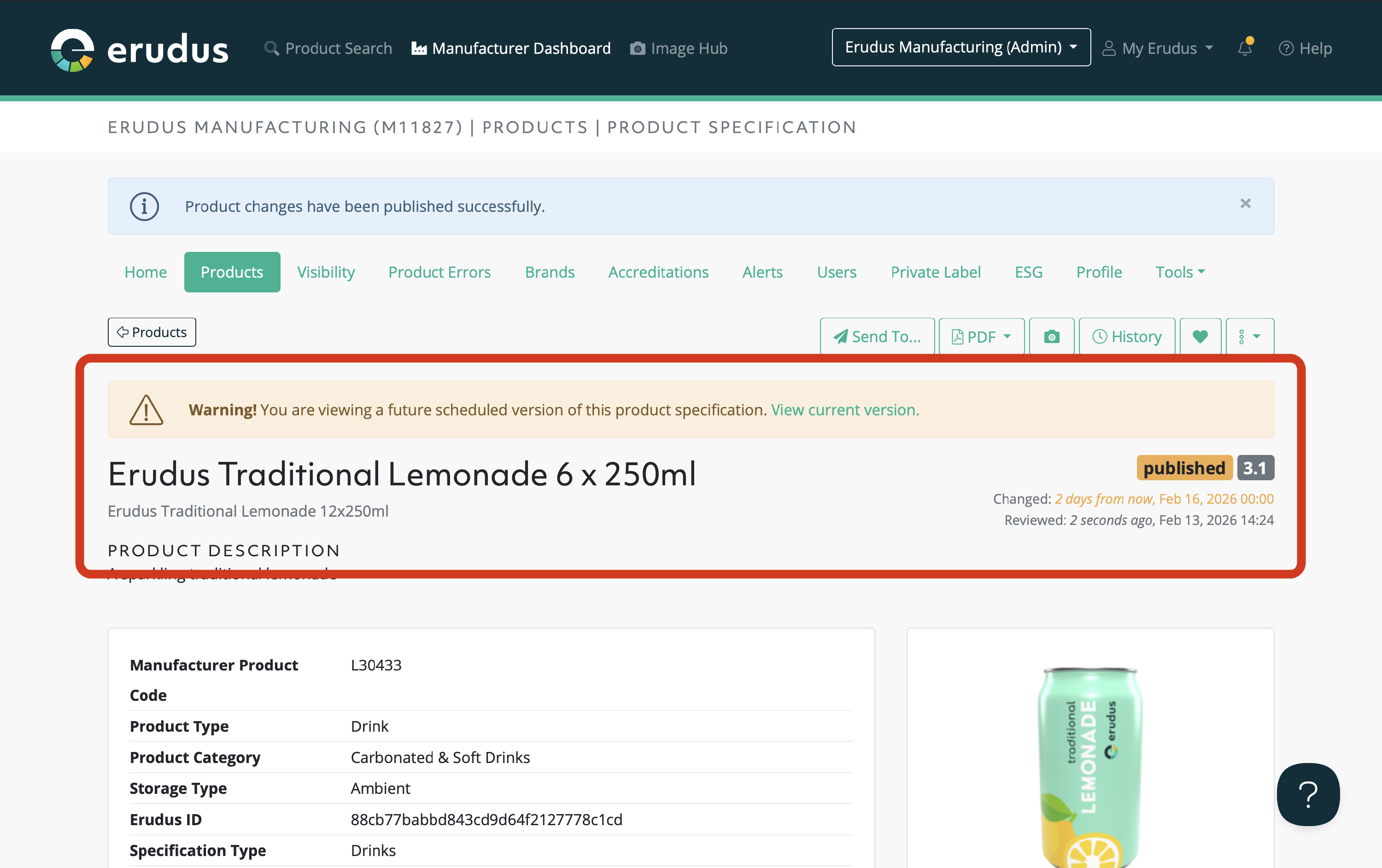 Once a product has a scheduled change, you'll see this appear in your Manufacturer Dashboard slightly differently from other products. You'll also see an indicator of this when viewing the product specification itself.