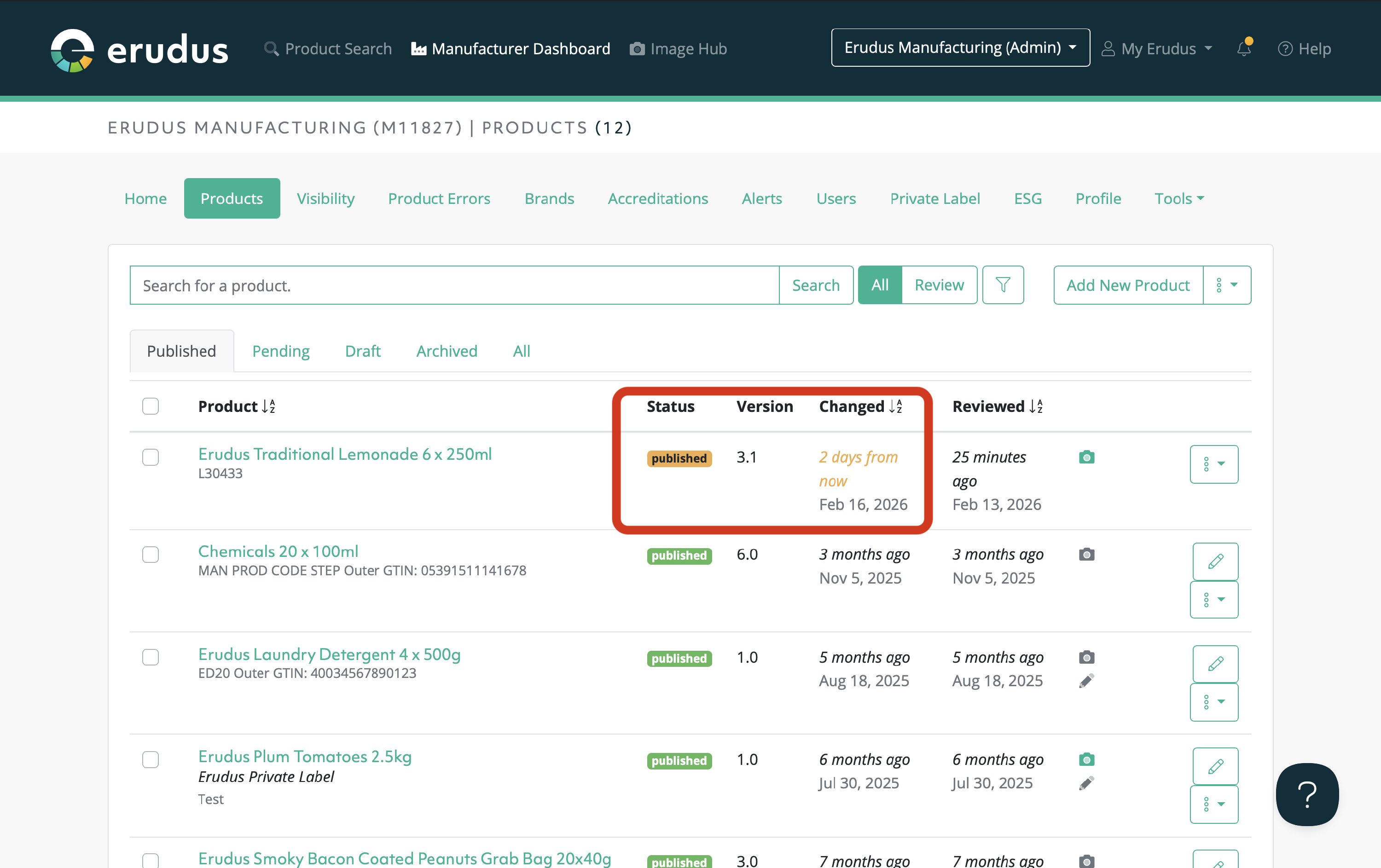 When viewing the product in your product catalog, you'll see a slight change in the colour of the published status and additional information about when the product will be live in Erudus: