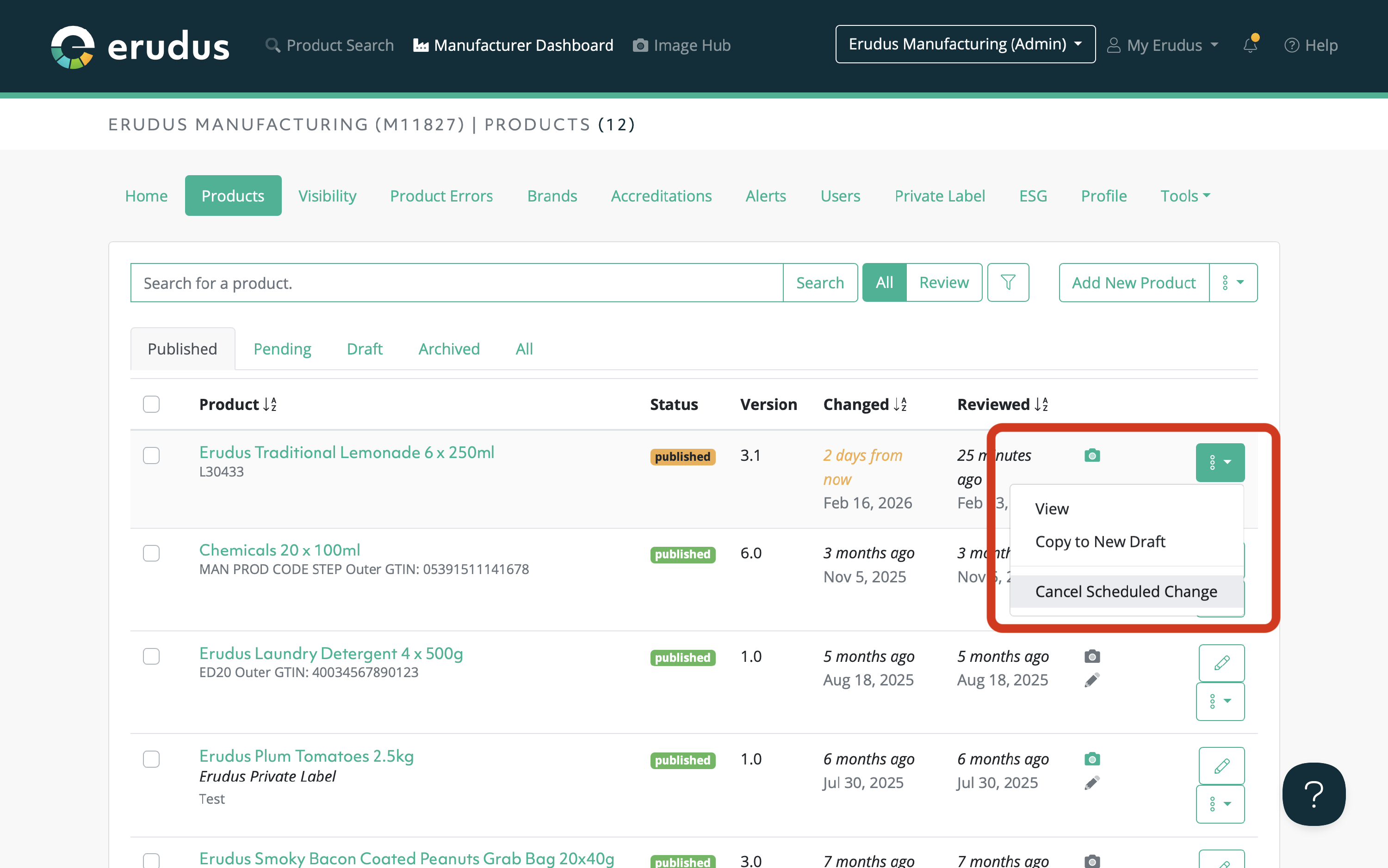 If you have published a product with a future scheduled change but now wish for the product to be published immediately, you can do so very easily. When viewing your products in Erudus, you can select the 3-dot drop located on the right-hand side of the product and select "Cancel Scheduled Change."