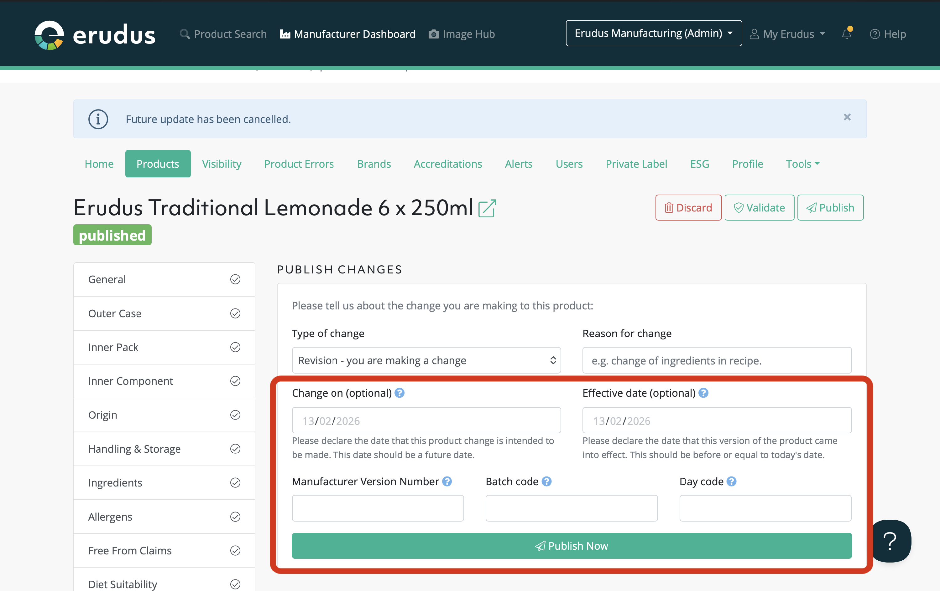 This guide will explain scheduled product changes in Erudus, how to publish a scheduled change, and how to remove a scheduled change.