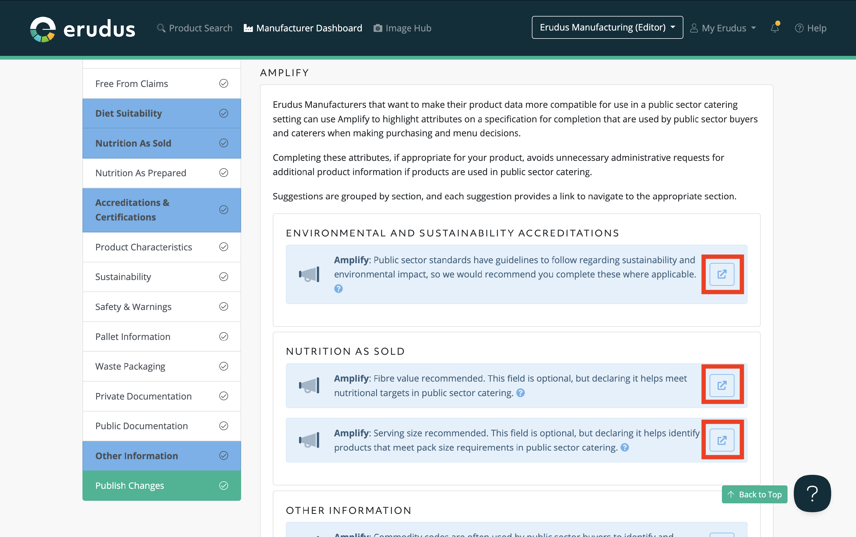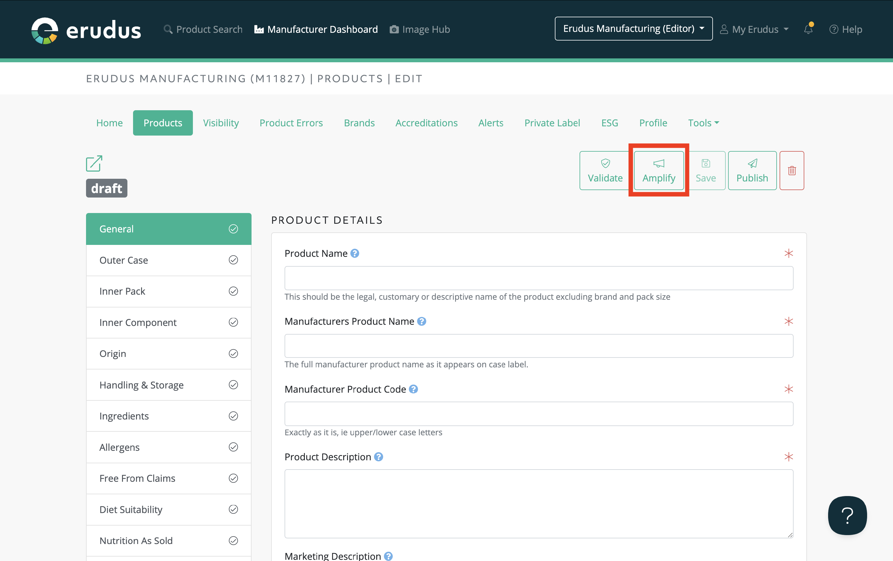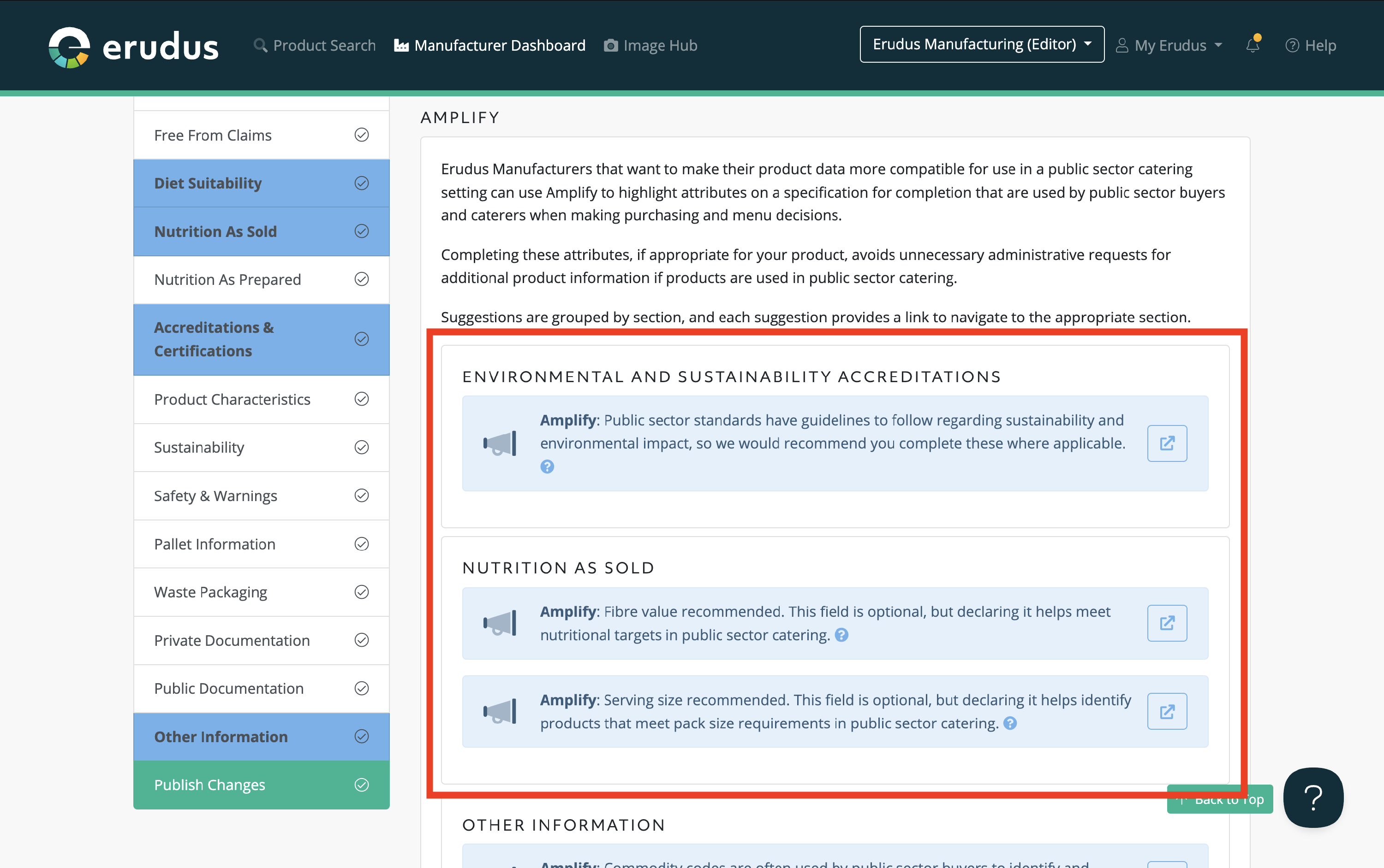 Erudus Manufacturers that want to make their product data more compatible for use in a public sector catering setting can use Amplify to highlight attributes on a specification for completion that would be used by public sector buyers and caterers when making purchasing and menu decisions, which ultimately avoids unnecessary administrative requests for additional product information