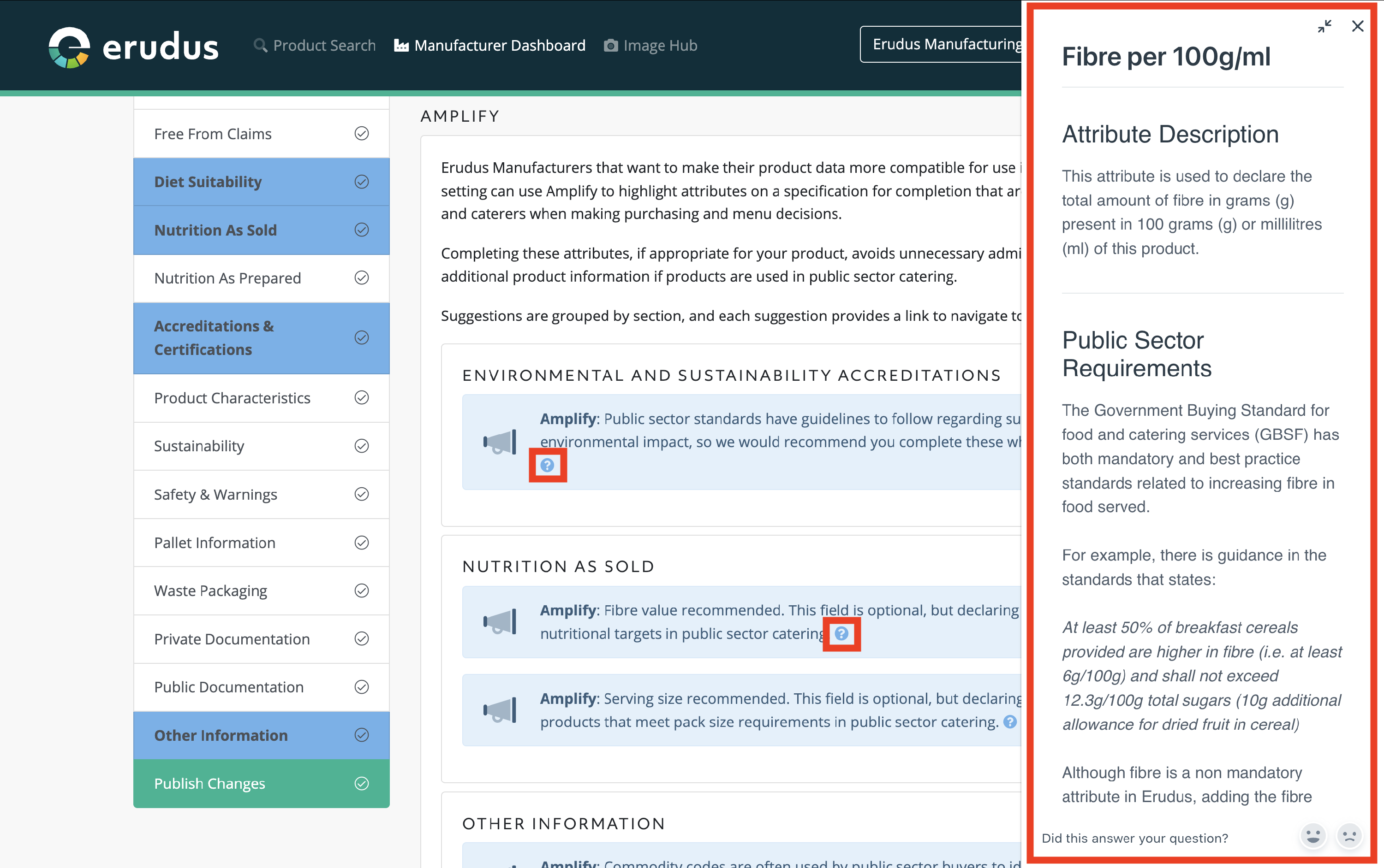 For more detailed information on the guidance that informs the attributes highlighted by Erudus Amplify, you can click the blue question mark (?) tooltip at the end of the message text. This sidebar guidance will have links to the public sector guidance for your perusal should you want to understand more about public sector buying standards as a whole